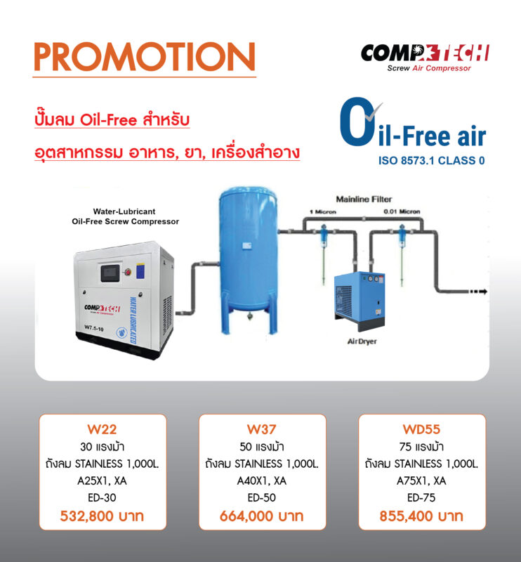 ปั๊มลมสกรู Oil Free COMPTECH W Series + AIRTANK + AIR DRYER พร้อม Mainline Filter พร้อมติดตั้งทันที ทั้งชุด !!!